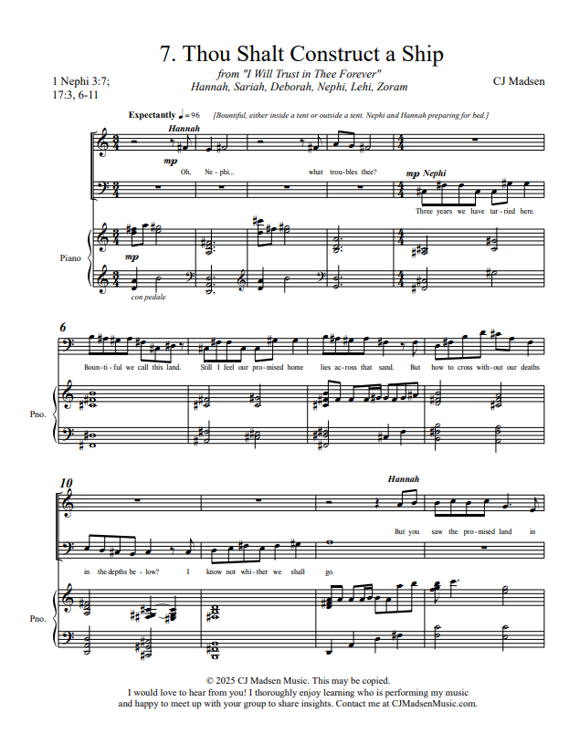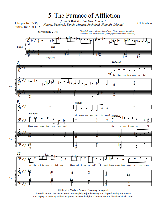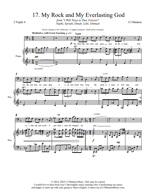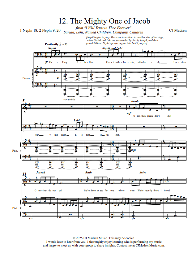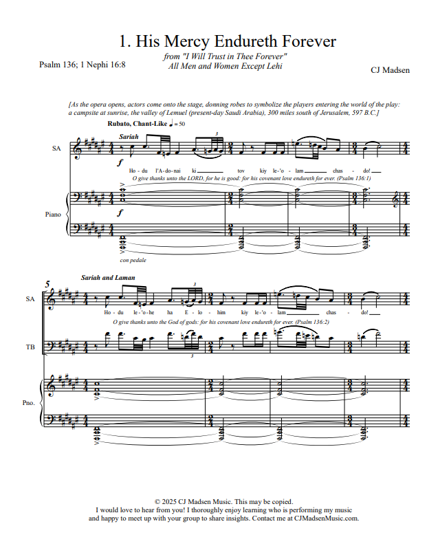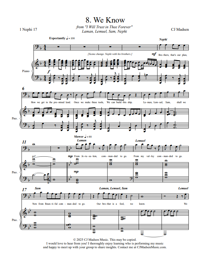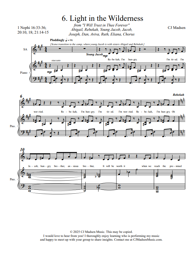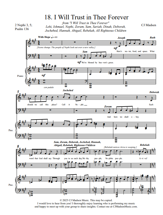 I Will Trust in Thee Forever is an opera that sets to music the story of the Book of Mormon from 1 Nephi 16 (just after the wedding of the daughters of Ishmael to Nephi’s family) to 2 Nephi 5 (separation of Nephi’s people from his rebellious brothers). It is a sequel to my 2021 opera, He Shall Prepare a Way, and also builds on my 2023 cantata, Tree of Life, Rod of Iron. Its message is to put your trust in Jesus Christ and rely on your covenants with Him, with the promise that He will take you places you never imagined. There are a projected 18 movements (90 minutes in length). The work is 33 percent complete and will be completed by September 1, 2025. This performance will be a concert sing-through (not memorized, just learned roles) to test run the opera. I will then revise the work in the summer of 2026 and stage the work in the 2026-2027 season.