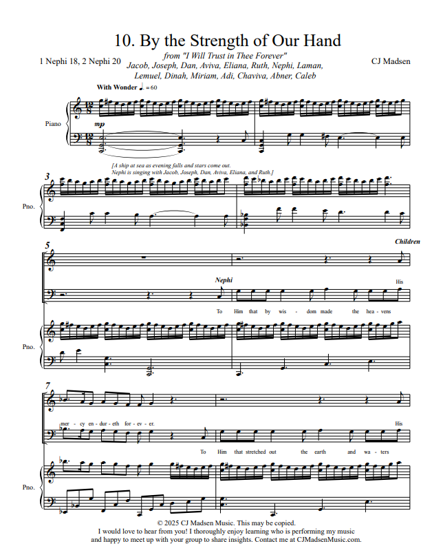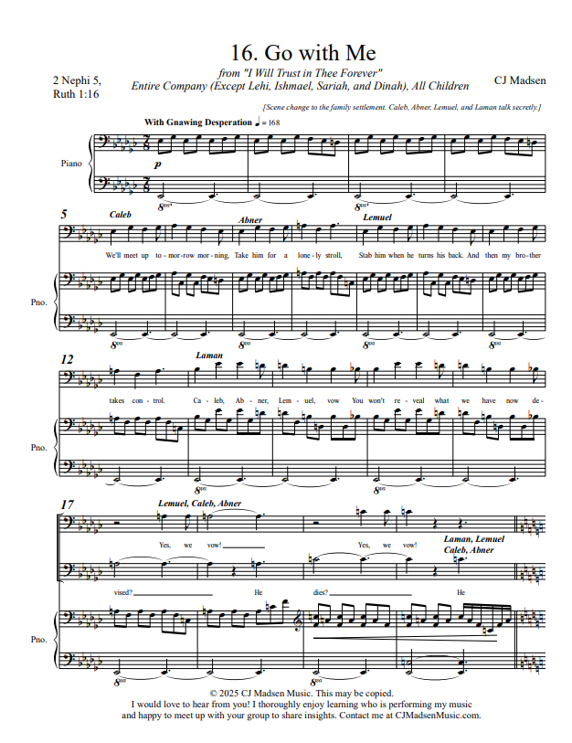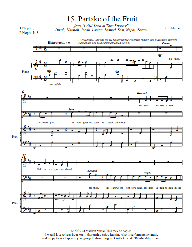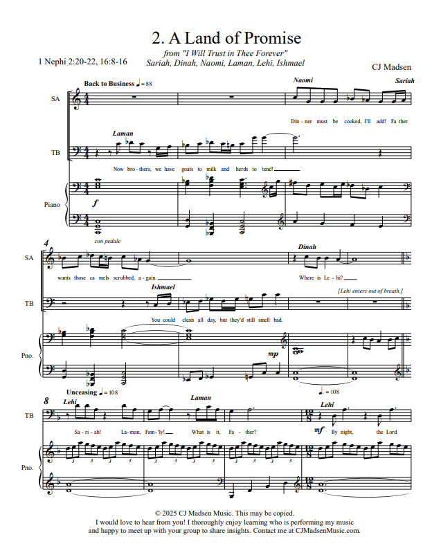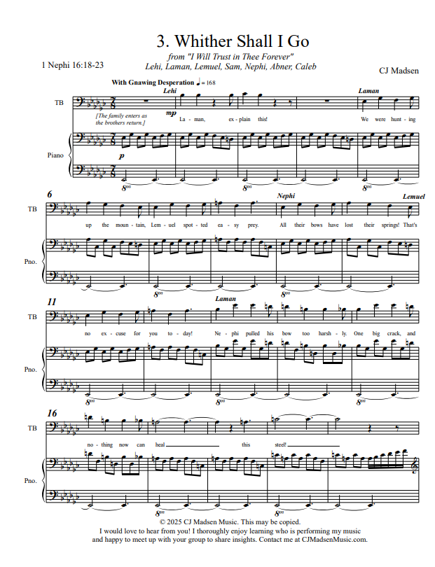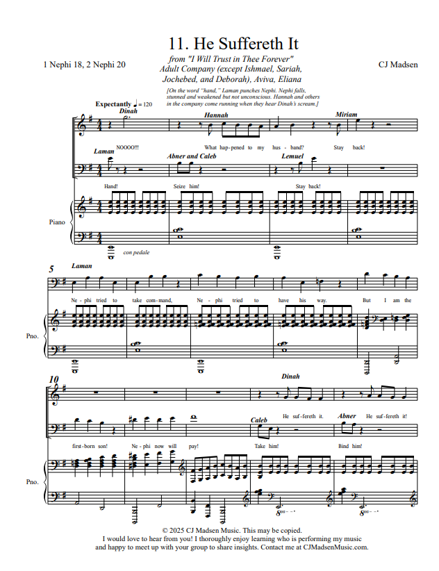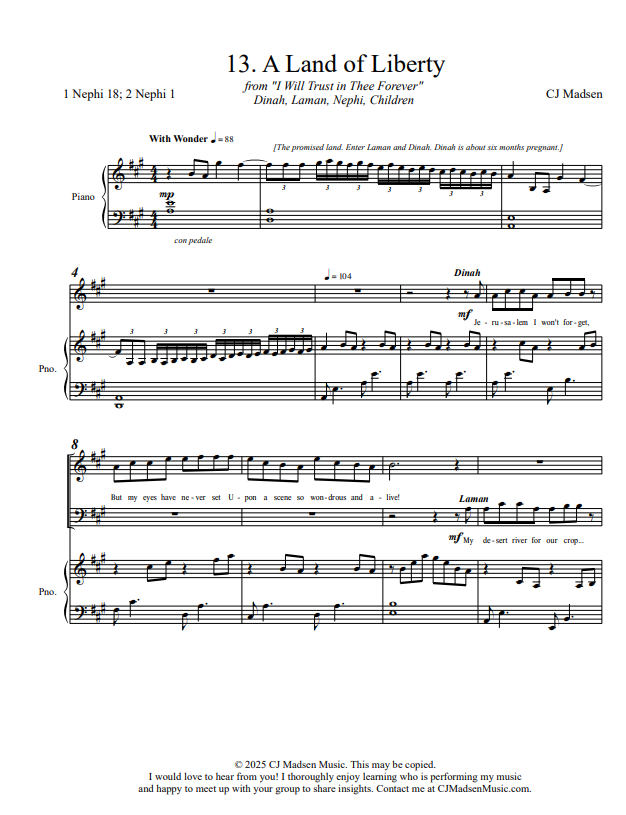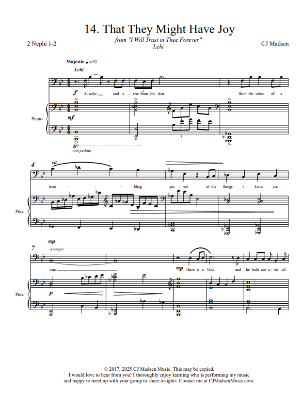 I Will Trust in Thee Forever is an opera that sets to music the story of the Book of Mormon from 1 Nephi 16 (just after the wedding of the daughters of Ishmael to Nephi’s family) to 2 Nephi 5 (separation of Nephi’s people from his rebellious brothers). It is a sequel to my 2021 opera, He Shall Prepare a Way, and also builds on my 2023 cantata, Tree of Life, Rod of Iron. Its message is to put your trust in Jesus Christ and rely on your covenants with Him, with the promise that He will take you places you never imagined. There are a projected 18 movements (90 minutes in length). The work is 33 percent complete and will be completed by September 1, 2025. This performance will be a concert sing-through (not memorized, just learned roles) to test run the opera. I will then revise the work in the summer of 2026 and stage the work in the 2026-2027 season.