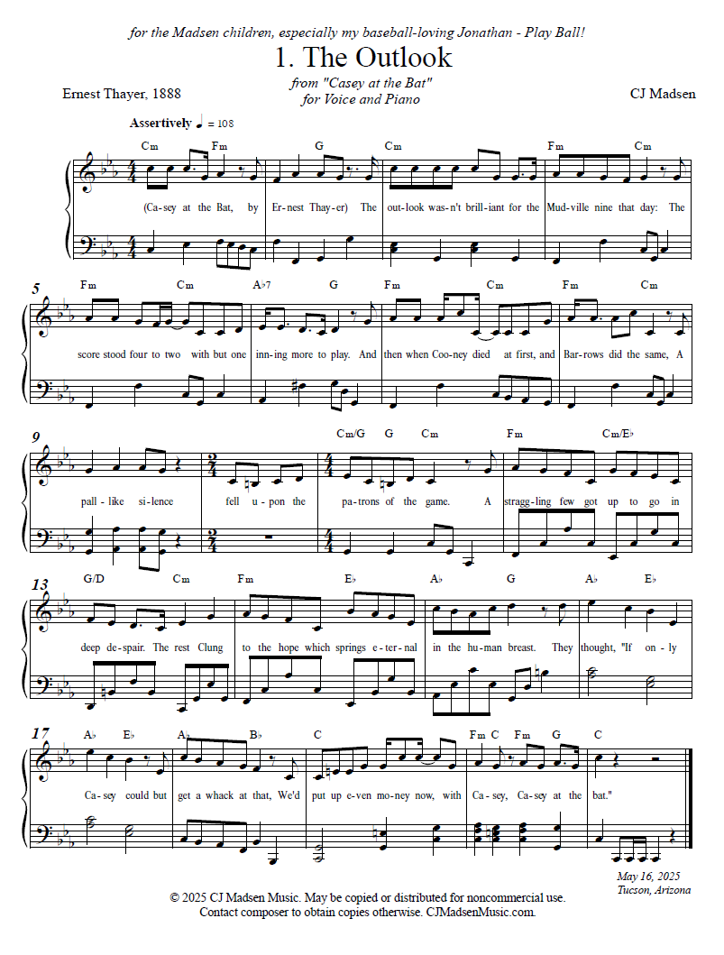Compositions are organized alphabetically. I include a quick list first, with dates of composition and links to individual songs. Following the quick list are each composition, with an image of the first page and links to view and download sheet music and recordings.