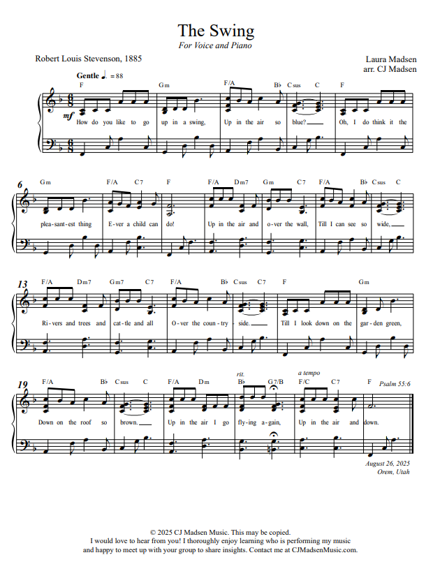 Setting of Robert Louis Stevenson poem, melody by Laura Madsen.